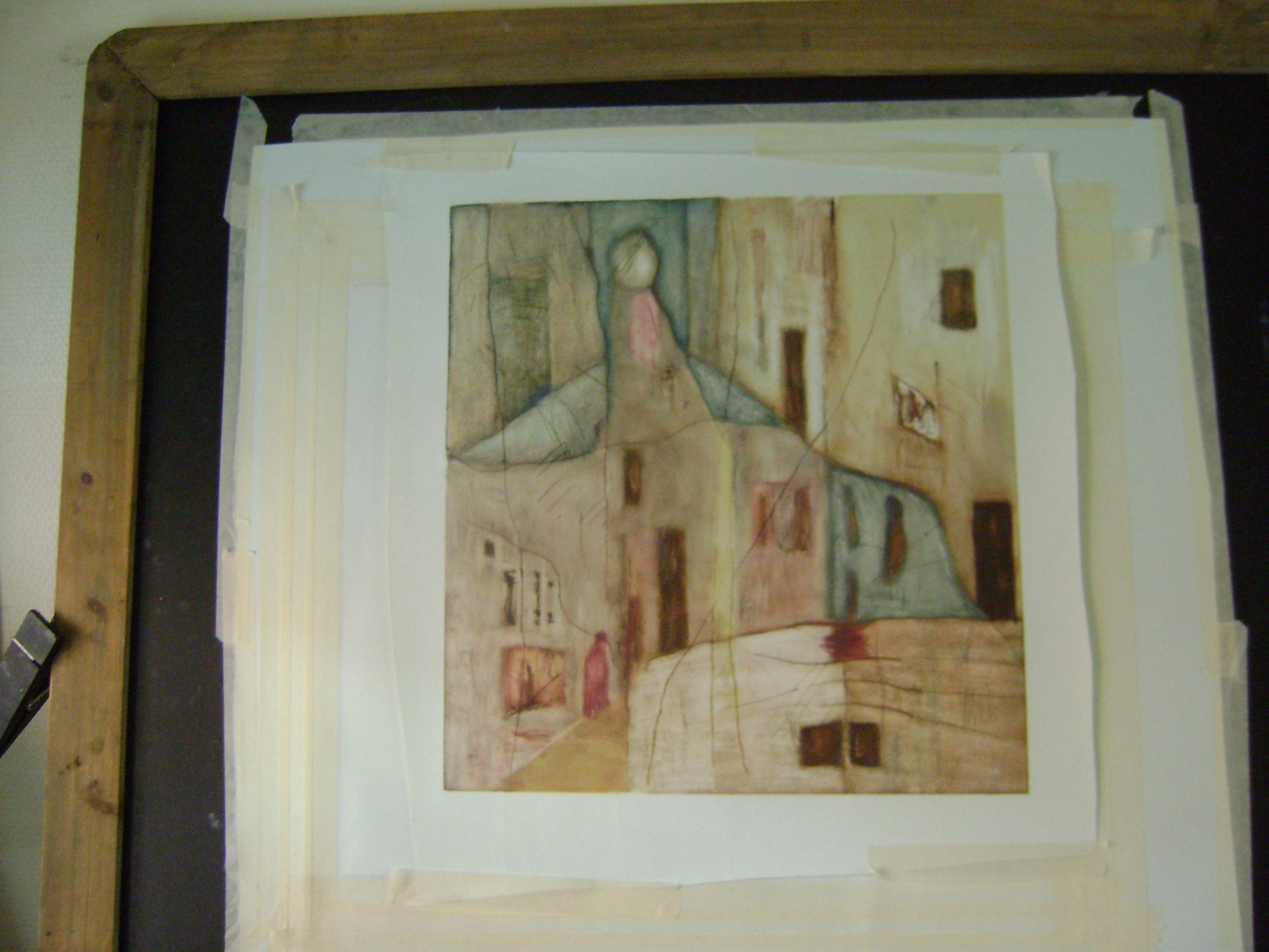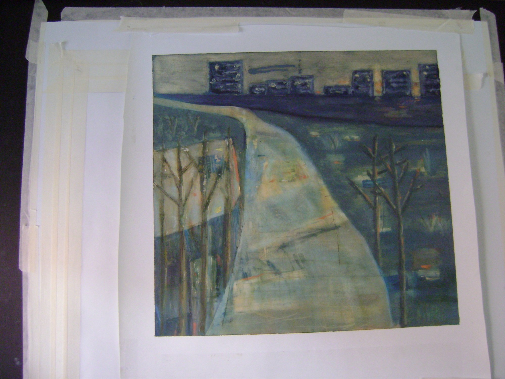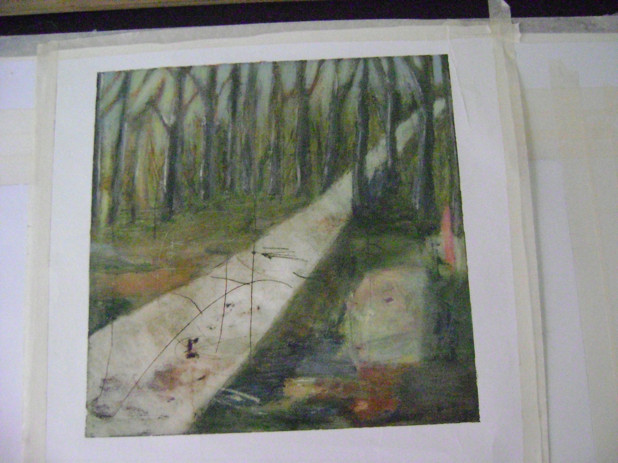 Mine billeder er malet med olie på kraftigt, voksbehandlet papir, der gør det muligt at lægge snit og ridser i billedfladen.